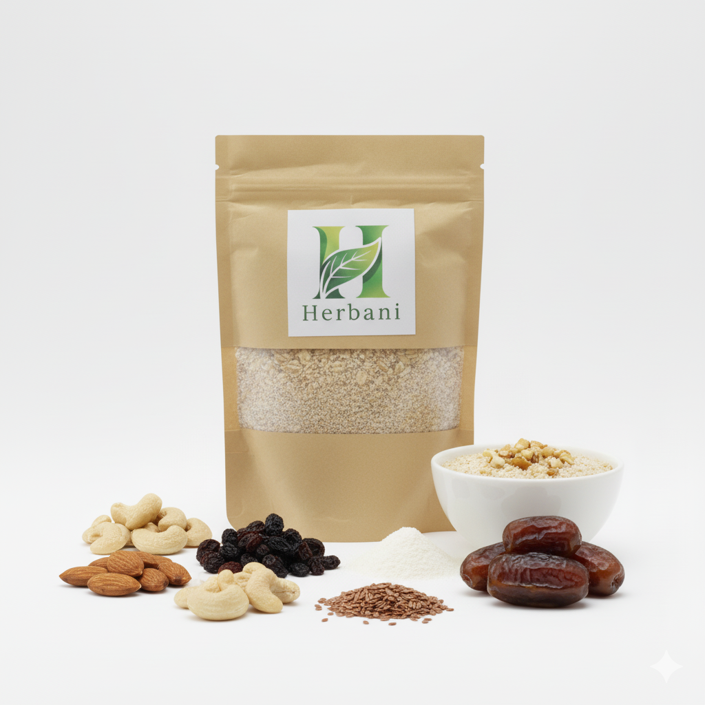 Inspired by the cherished tradition of the Prophet Muhammad (ﷺ), Herbani brings you a truly wholesome and spiritually uplifting experience with our premium Talbina Powder. Crafted from a harmonious blend of nature's finest ingredients, including Black raisins, Sabu Dana, flax seeds, barley powder, dried dates, poppy seeds, almonds, semolina, 4 maghz, cashew nuts, walnuts, phool makhana, and chickpea powder, our Talbina is designed to nurture your well-being in every aspect.